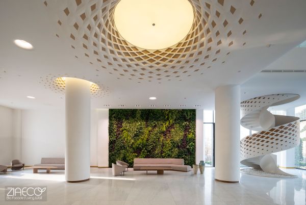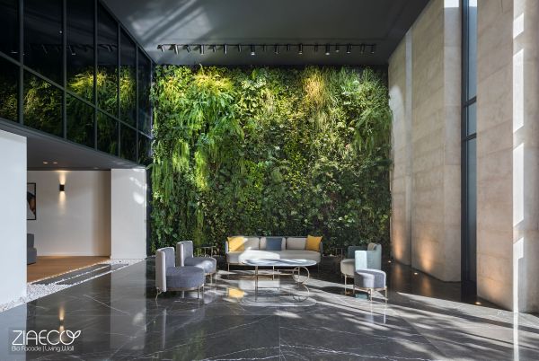In luxury buildings, one of the key factors in increasing property value is the quality of the lobby and its elements. One feature that enhances this quality is the presence of natural spaces within the lobby. The greenery in this area brings a small piece of nature into the building, softening the connection between people and the space as they enter.