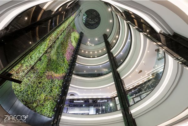 The Hedish Mall green wall is recognized as the tallest indoor green wall in Iran. It stands 21 meters high and 6 meters wide, featuring a rich variety of plant species. These include Silver Aglaonema, Scandens, Weeping Fig, Chamaedorea, Dracaena Compacta, Spathiphyllum, Anthurium, White Aglaonema, Black Aglaonema, and Schefflera, totaling 5,670 plants. The remarkable diversity and sheer number of plants create the impression of a dense forest, visible across different levels of the building. Visitors are often captivated by the lush greenery, taking the freshness with them, photographing it, and sharing their experience.