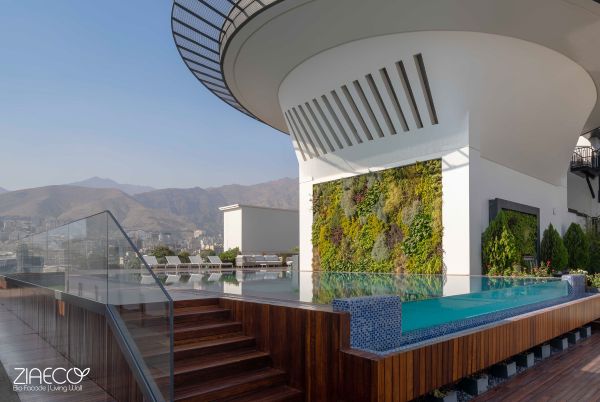 The lobby of the North Tower, which also serves as the main entrance to the complex, was designed with an Iranian architectural approach, incorporating traditional elements executed with a contemporary design. The tower façades feature terraces with double-layered planters, centrally irrigated and controllable from the rooftop. Although the planters were added to the façades after the building’s completion, all the infrastructure was smartly designed and implemented to ensure easier maintenance in the future. In other words, we believe that plants are an integral part of the tower’s façade and should not compromise its structure or design, nor should the plants wither.