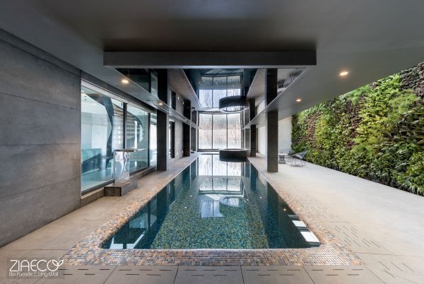 The presence of a green wall next to the pool makes the air passing through the plants pleasantly refreshing and increases the oxygen level in this humid environment. Additionally, the circulation of air over the water surface provides the moisture needed for the plant leaves, keeping them fresh and vibrant. Beyond these functional benefits, the greenery adds a visually captivating element to the space, combining shades of green and blue to evoke a sense of calm and tranquility for visitors.