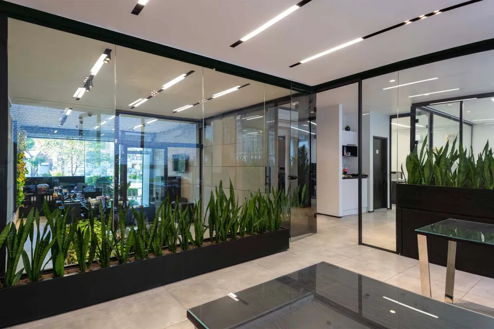 - Multi-Dimensional Design: The combination of hydroponic green walls, green islands, and flowerboxes in this project distributes greenery across several points of the exchange office, improving both the visual appeal and air quality of the interior space.