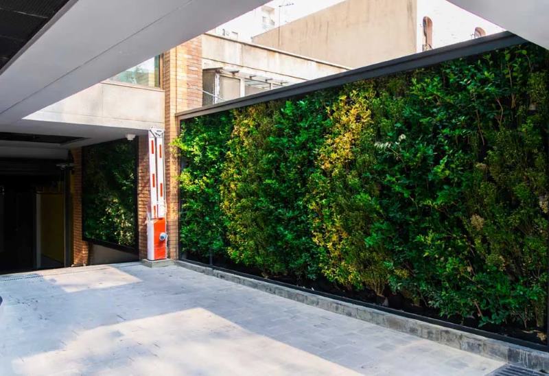 • فضای سبز در ورودی: دیوار سبز در ورودی خانه می‌تواند به‌عنوان یک المان زینتی عمل کرده و همچنین بر زیبایی و جذابیت محیط بیفزاید. این فضای سبز به عنوان یک عامل تصفیه‌کننده هوا، به بهبود کیفیت محیط کمک می‌کند.
